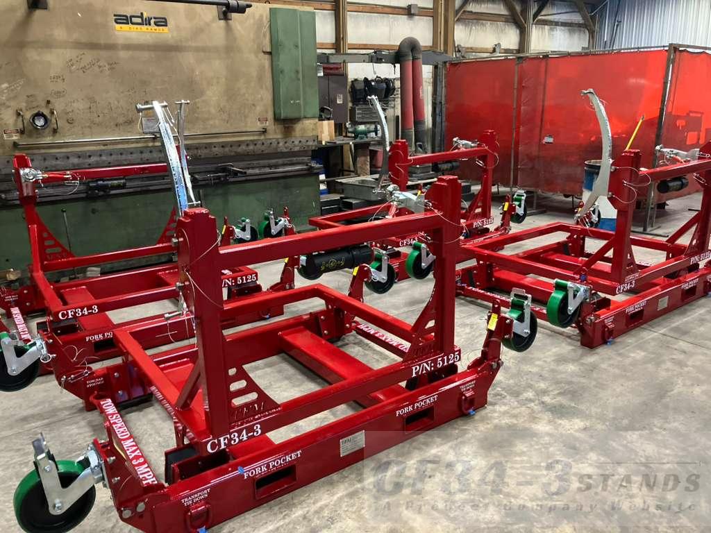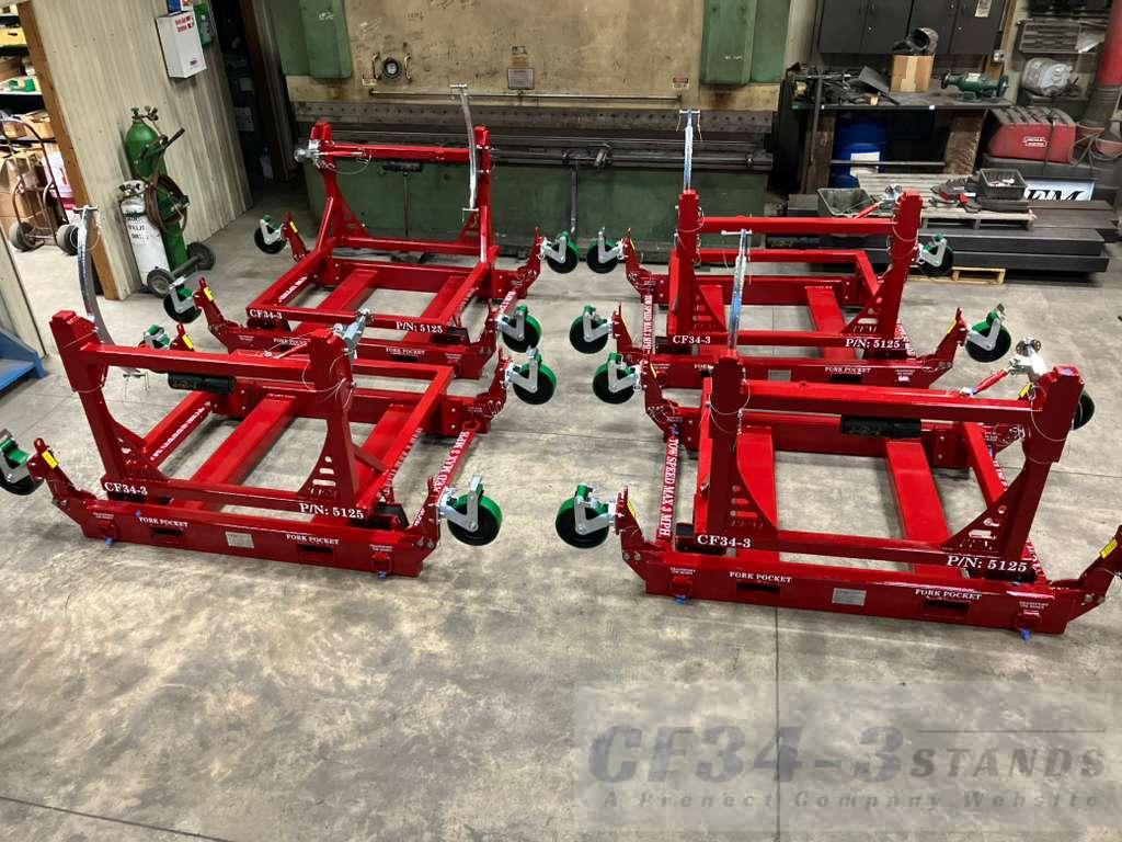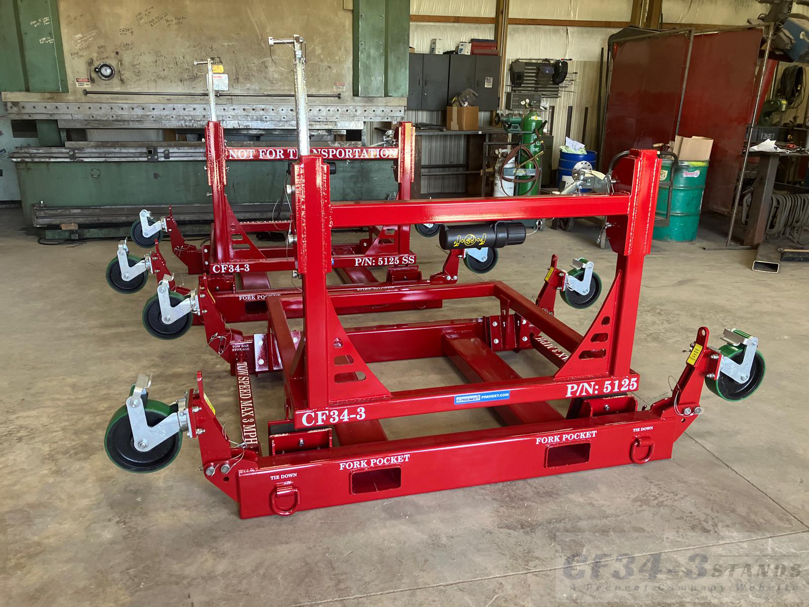 Stand consists of separate base and cradle assemblies and provides convenient features to securely transport CF34-3 engines. This engine stand includes, stainless-steel hardware, four shock mount isolators, Painted or Plated Mounts and is proof-loaded per applicable ground handling documents. This is a non-bootstrap stand.
